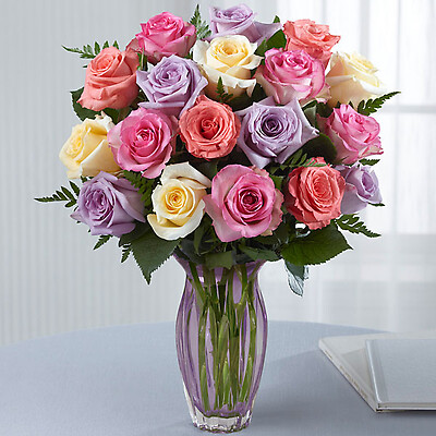 With a look as sweet as spun sugar, this fresh and lovely bouquet of pastel roses makes a welcome way to celebrate your mother, any special occasion or express any heartfelt wish. Lavender, pink, coral and cream colored roses create a loving harmony of springtime colors that will be long remembered, all beautifully hand-arranged by an artisan florist in a heavy, lilac-hued glass, heirloom-quality vase.