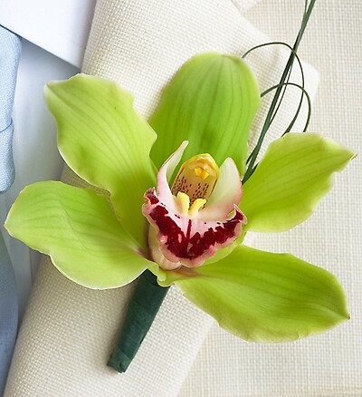 He's sure to stand out when sporting our beach-themed boutonniere. Whether you choose a green rose or a green Cymbidium orchid, each accented by bear grass, this arrangement is a stylish addition for him to wear on his lapel at proms, weddings or any special celebration. You can also choose our matching mini green Cymbidium orchid boutonniere, perfect for a ring bearer or any dashing young man.